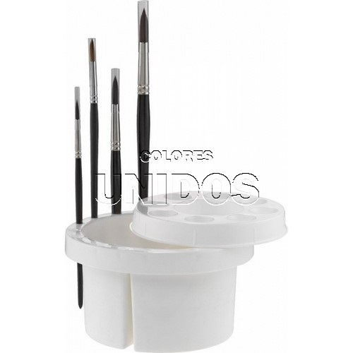 Limpiador de pinceles con un diámetro de 16,5 cm. Con tapa que también se puede utilizar como paleta de mezclas. Se pueden colocar 18 pinceles en el anillo exterior y también contiene dos cámaras de lavado separadas