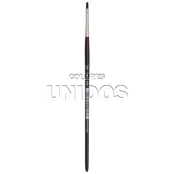 Pincel plano nº 1/8. Pincel de pelo sintético burdeos, con una abrazadera transparente de color plateado y un mango corto lacado en negro.