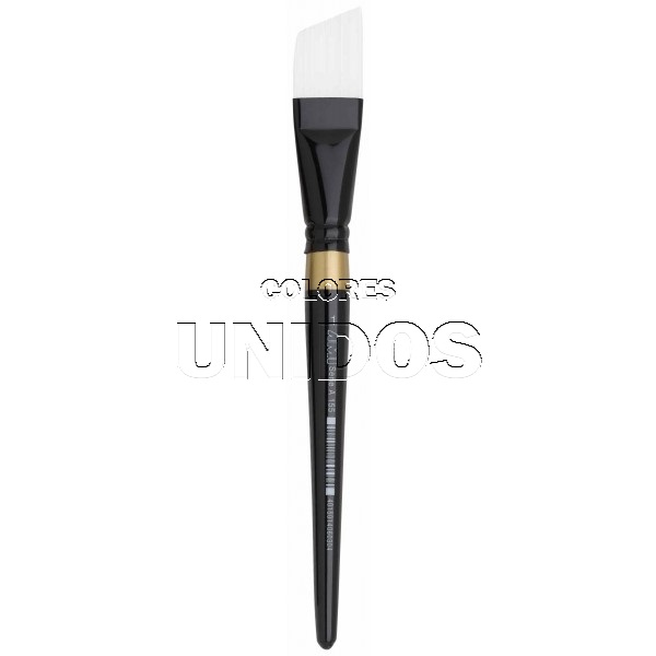 Pincel plano cortado nº 1, con pelo sintético blanco, con una abrazadera sin costuras de color plateado y un mango corto lacado en negro.