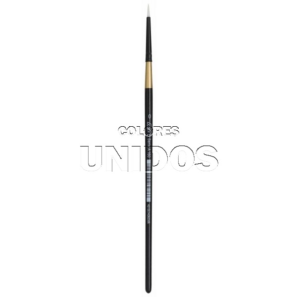 Pincel redondo nº 0, con pelo sintético blanco, con una abrazadera sin costuras de color plateado y un mango corto lacado en negro.